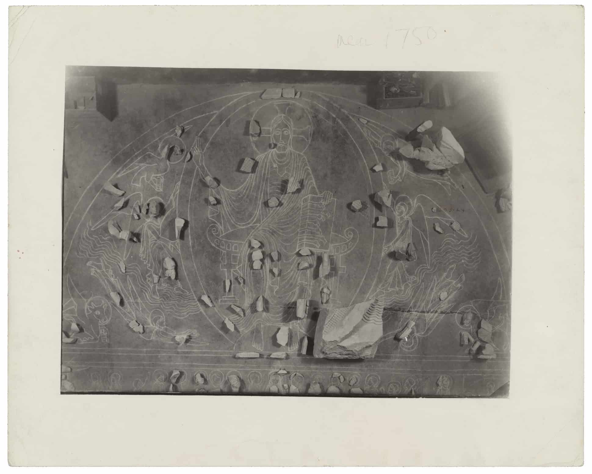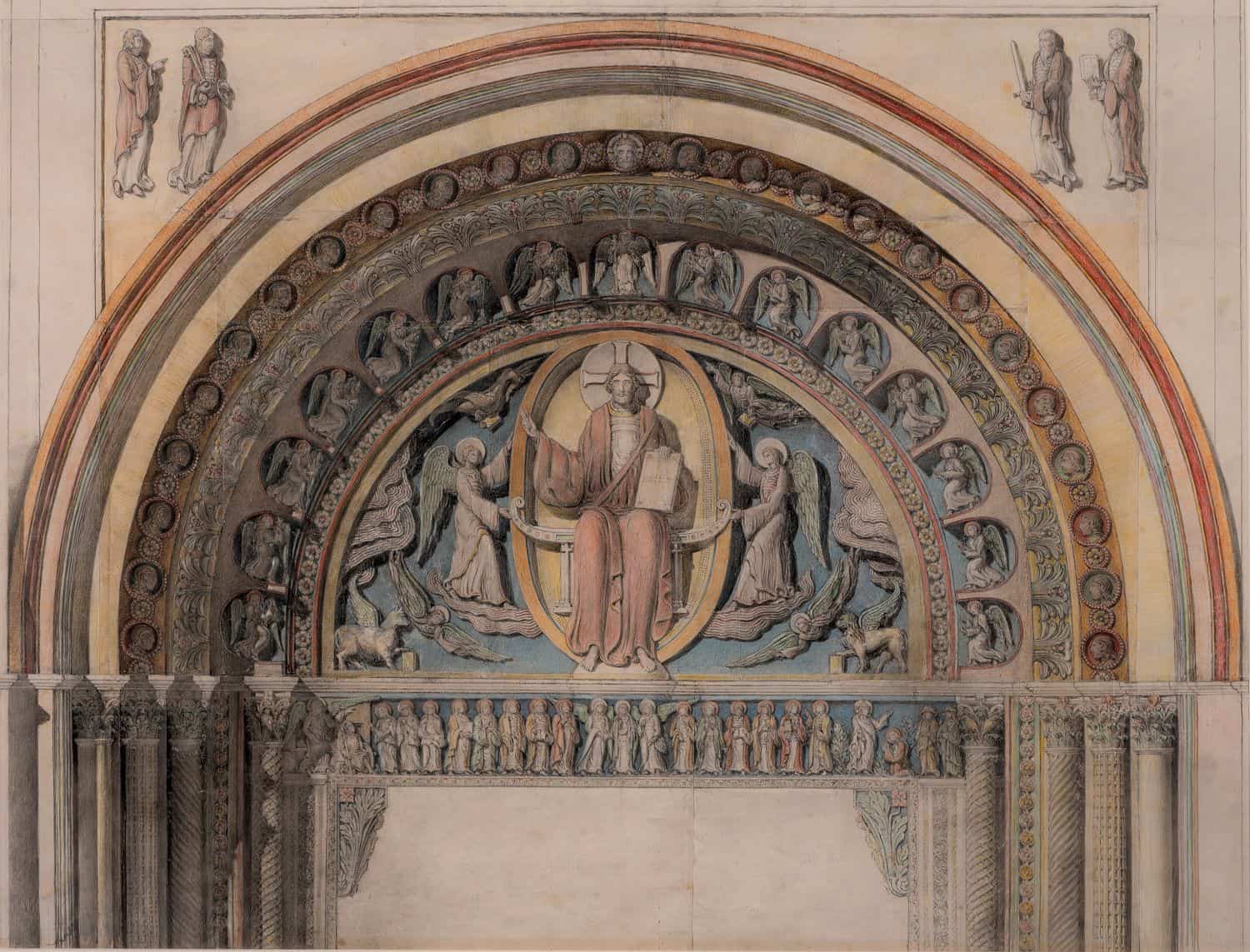 We highlight three especially spectacular examples of Conant’s skill in re-creating the whole from the part. All three show the transformation of the banal, the broken, and the inconsequential into the extraordinary, the amazing, and the beautiful. First, his large measured plan of the right half of the chevet of Cluny III (fig. 72) of which his full scale replica of the apse hemicycle at Cluny III in the Fogg Museum courtyard is the extrusion (fig. 73). What he understood from excavation and measurement, he then envisioned and realized in three dimensions. From the remains of Cluny’s footprint he erected the apse . That an architect would be able to deduce the elevation from the plan seems no great achievement unless, as was the case with Conant’s work with Cluny, the stylistic and structural assumptions of the original builders were unknown. Second, from the few broken sculpted fragments of the tympanum that had been blown up, Conant restituted its majestic sculpted and painted Maiestas Domini (figs. 74, 75). And third, perhaps the most remarkable and beautiful of all Conant’s efforts to envision Cluny is the large colored drawing of the church seen from the apse and showing the radiating chapels, ambulatory, and apse rising from the partial plan, the two transepts with their towers, and the towers of the west facade depicted ever more faintly as they recede in distance (fig. 76). Comparison with a print of almost the same view (fig. 77), which could have given him the idea of showing the whole by means of its high volumes, reveals the visionary, almost transcendental quality of Conant’s own representation. Truly, as he said shortly before his death, “Ah, Cluny … How wonderful … only paradise is more beautiful.”[7]