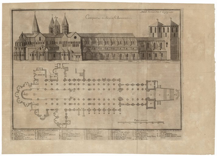 The reformed Benedictine abbey of Cluny in central France, founded in 910, was so attractive to those seeking monastic profession and grew in numbers so rapidly that no less than three church buildings were erected on the property on the same or adjacent sites within 200 years: scholars refer to these as Cluny I, II, and III. The last and greatest of these, begun in 1088, stood until the French Revolution and was dismantled – some of it even dynamited – between 1792 and 1819. Of the physical fabric, only the major and minor south transepts and parts of the south ambulatory aisle remain above ground (fig. 40). The whole monastic complex is known from prints, seven of which were given by Conant to Harvard’s Fogg Museum (41, 42, 43, 44, 45, 46, 47), as well as from drawings, documents, and literary accounts. From these sources we know that Cluny III was, at completion around 1130, the largest building north of the Alps, measuring some 500 feet long and 100 feet high. It was unusual not only in size but in form, having two transepts and a total of eight towers and was among the earliest buildings north of the Alps to have an ambulatory with radiating chapels, pointed arches, and flying buttresses in the nave. We see it still intact in P.-F. Giffart’s 1713 plan and elevation for Jean Mabillon’s Annales ordinis S. Benedicti occidentalium monachorum patriarchae (fig. 48).