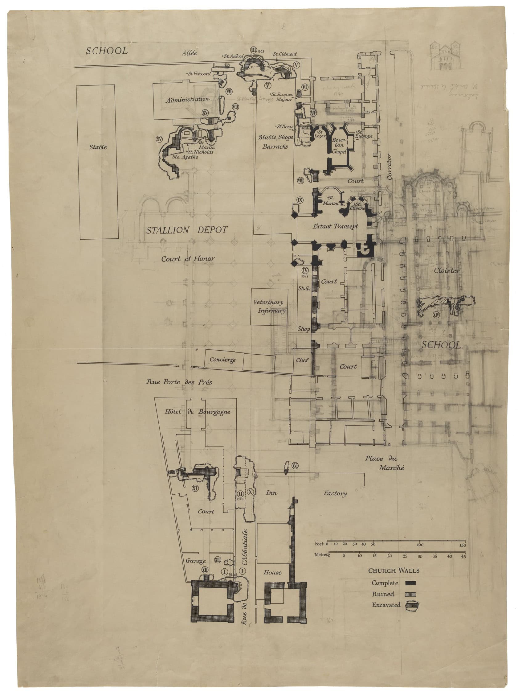 Cluny III showing existing masonry in relation to present structures: the stallion depot, a charter school, a hotel, and houses