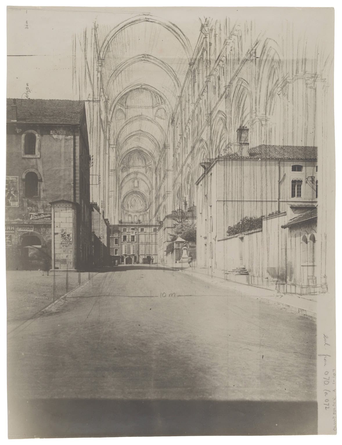 Conant’s visual imagination integrated the present reality of Cluny with what had once existed in a variety of ways using various media. For example, using an aerial photo of the town of Cluny, Conant collaged on to it a photo of a model of Cluny III in the Cluny museum (Musée Ochier) and added around it in pencil the original monastic complex with walls and service buildings (fig. 53). Having realized that the lowest parts of the two thirteenth-century towers of the west façade still existed incorporated into houses, Conant envisioned the interior elevation and vaults of Cluny III above and behind these, extending deep in recession (fig. 54). Around a photograph of an extant capital from Cluny’s apse, Conant re-created its original architectural context in pencil: the half-column and its necking engaged to the coursed limestone masonry; a string course or echinus and abacus supporting an arch with its classicizing molding (fig. 55). The degree and kind of classicism of Cluny III would remain another topic of disagreement among scholars.[5] One of his most extraordinary re- creations is a photo of a model of the original west portal collaged with other elements both drawn and photographed; a “monk” stands in the doorway to provide scale (fig. 56).