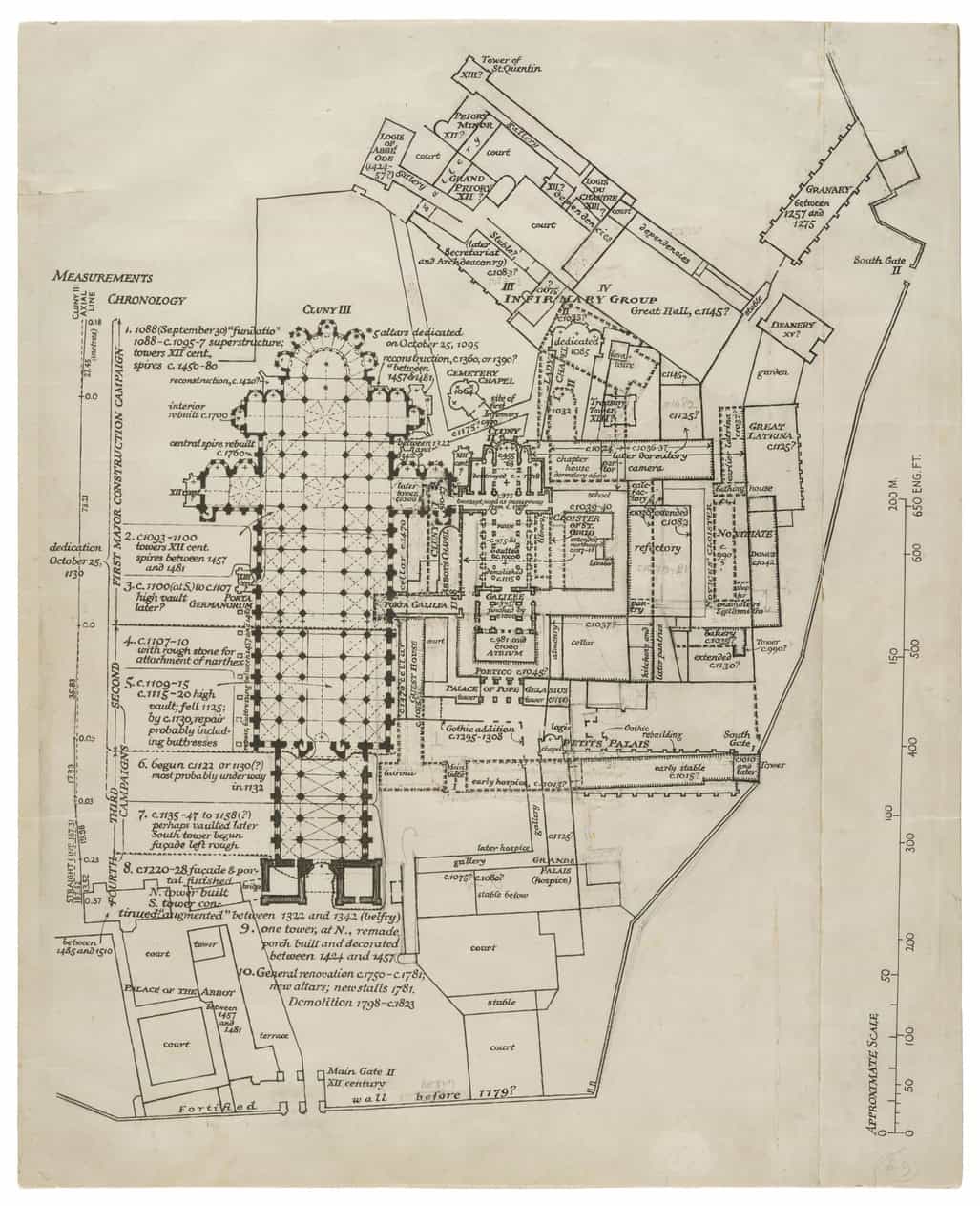 Reconstruction of Cluny II (right) and Cluny III (left) with notations on the chronology of construction, identifications of places, and liturgical furnishings
