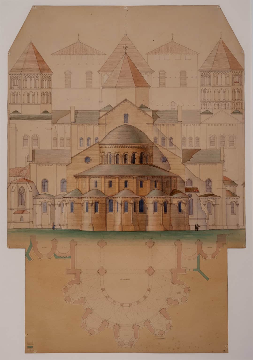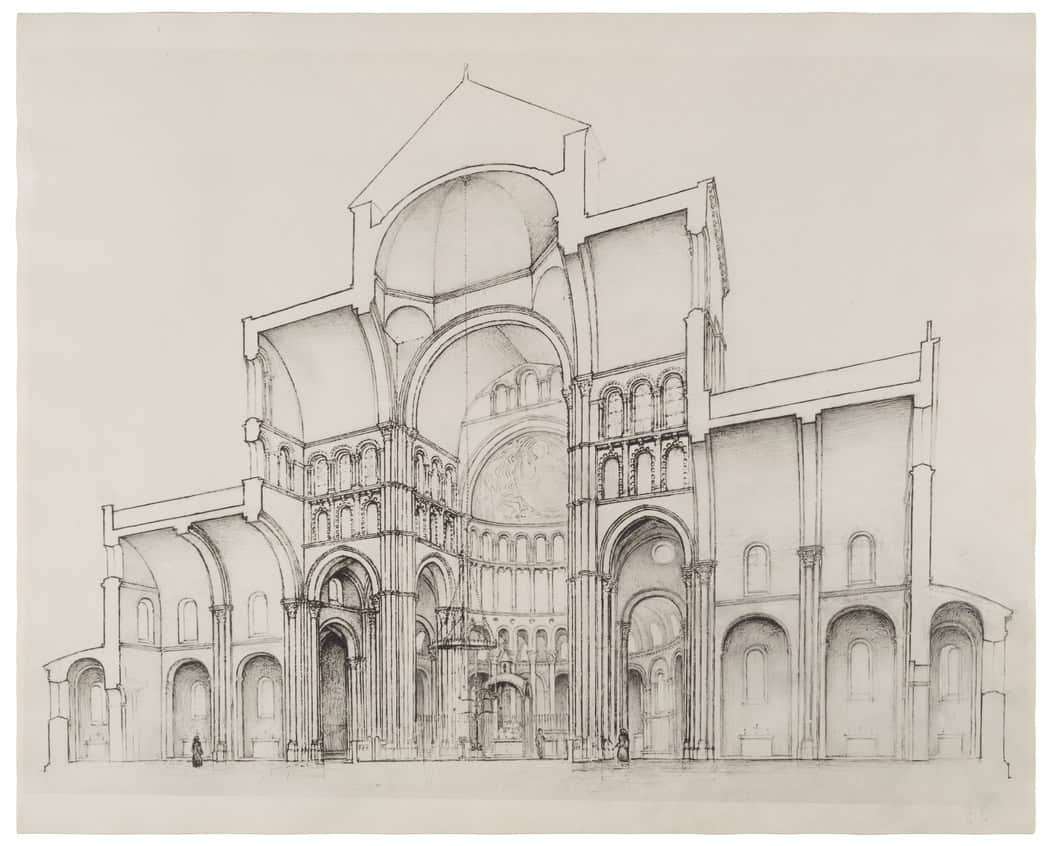 Reconstruction of Cluny III. Longitudinal section from the extreme east end chapel, through the ambulatory, apse, presbytery and south/east transept, and first two choir bays