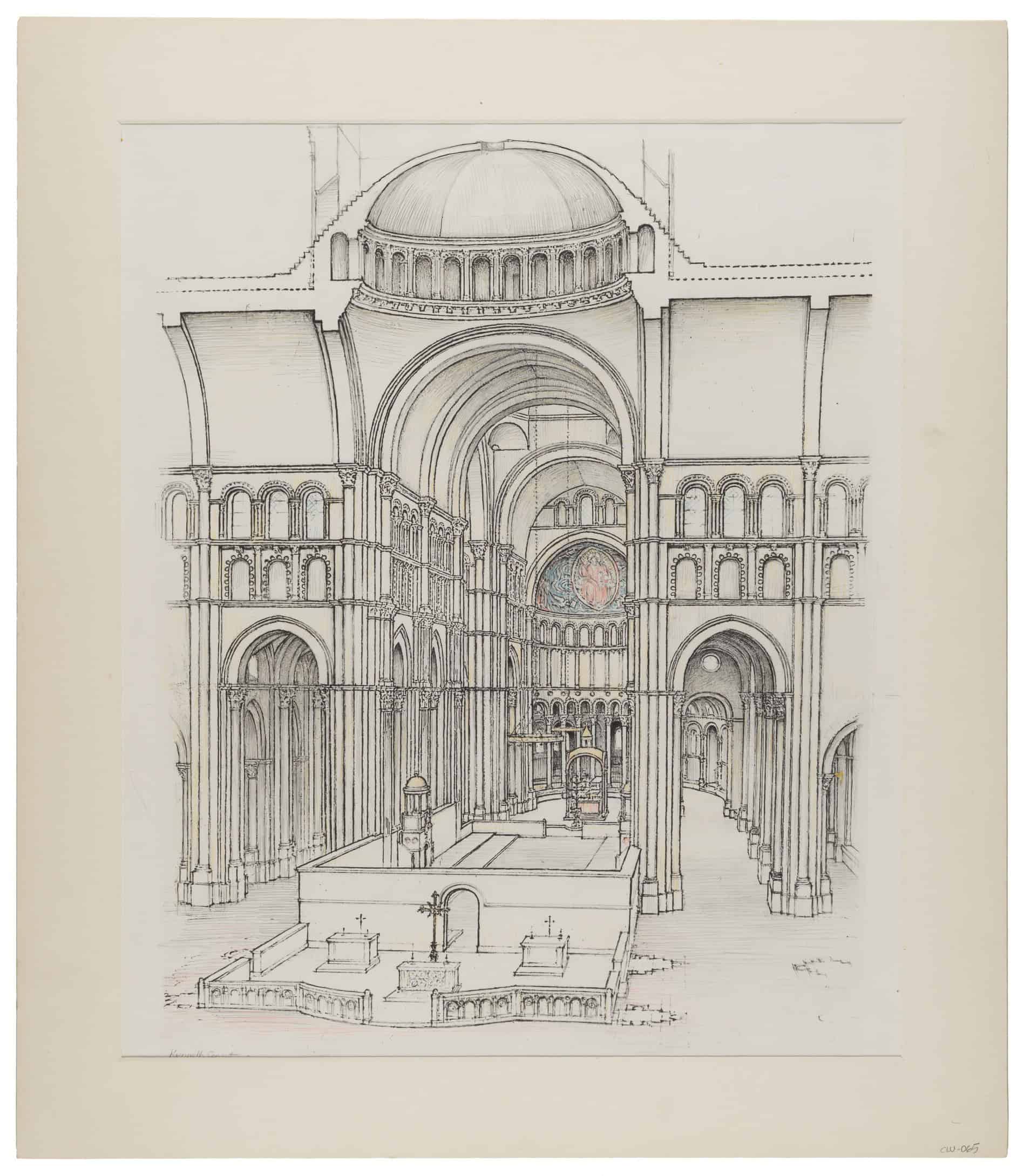 Conant’s training as both an architect and a historian and his experience with excavation enabled him to reconstitute the whole from the part. In this, his practice was radically different from that of his mentors Richardson, Warren and Porter, who were adept at picking out the significant or useful detail but less committed to identifying the unifying DNA of the whole – what Aristotle called the eîdos – the formal cause. It seems likely that this change is due not only to the development of architectural history as an academic field of research, but also because widespread loss of major historic monuments due to bombing in the two World Wars heightened awareness of the need to understand and record them as wholes. Conant re-created accurately dimensioned and structurally plausible elevations of Cluny from the available evidence. For example, figures 60 and 61 are highly finished measured drawings showing a half transverse section and nave wall elevation of the first nave bay. The drawing itself is byTurpin Bannister, Conant’s student at Harvard in the early 1940s and one of those who formed what became the Society of Architectural Historians in 1940. While elegant, Bannister’s drawings seem coldly precise. They record what was built so that the mind can understand it and perhaps even build it, with little or no appeal to the imagination. Conant also drew Cluny as a formal abstraction (fig. 62) but only to display the ideality of its form: his caption to this illustration in his book is “Le Plan de Cluny dans sa perfection.”[6] More typical of his drawings is fig. 63, a view of Cluny’s apse with its liturgical furnishings – the gospel and epistle ambos, tall branched paschal candlelabrum, ciborium over the high altar, the altar itself barely glimpsed through an opening in the choir screen, and rotae (wheel-shaped chandeliers), most (but not all) of which are documented – behind all this the apse hemicycle with columns figured capitals and the apse conch with Christ Enthroned partly painted and partly in mosaic. In the foreground a tomb (perhaps that of Pope Gelasius II, who died in 1119, recorded in that position outside the monks’ choir) and an altar. Conant represented not just what was there, but how it was lived and what effect it made on the spectator whereas Bannister’s hand recorded a lost architectural structure. Conant’s many views of the interior of Cluny as if seen from slightly different places in the building, as if experienced by a visitor, comprise an almost cinematic sequence (figs. 64, 65, 66, 67, 68, 69, 70, 71).