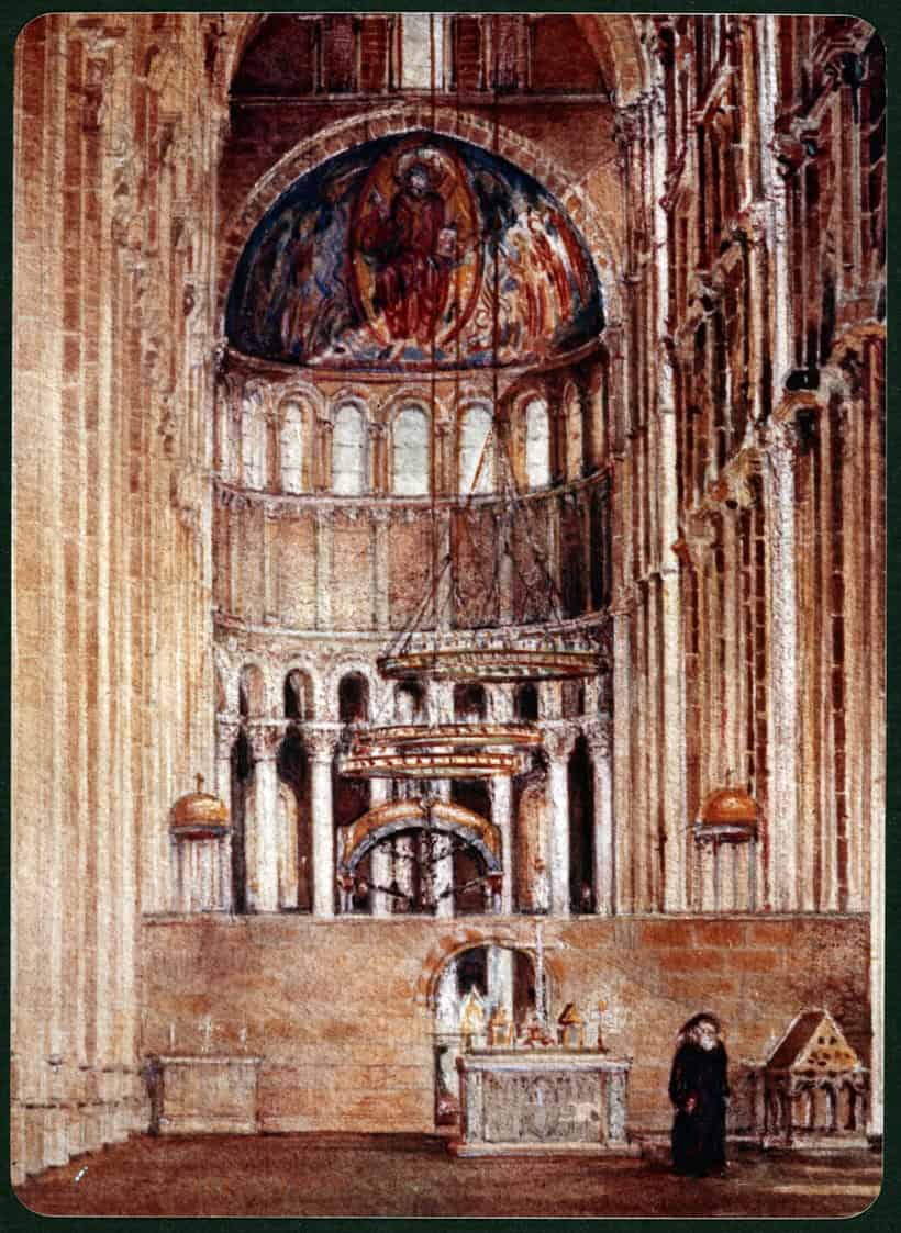 Reconstruction view of Cluny III. View from the west transept of the altars before the monks’ choir enclosure, liturgical furniture in the choir (corona, pulpit, presbytery and high altar), with apse hemicycle columns, capitals and apse conch fresco/mosaic
