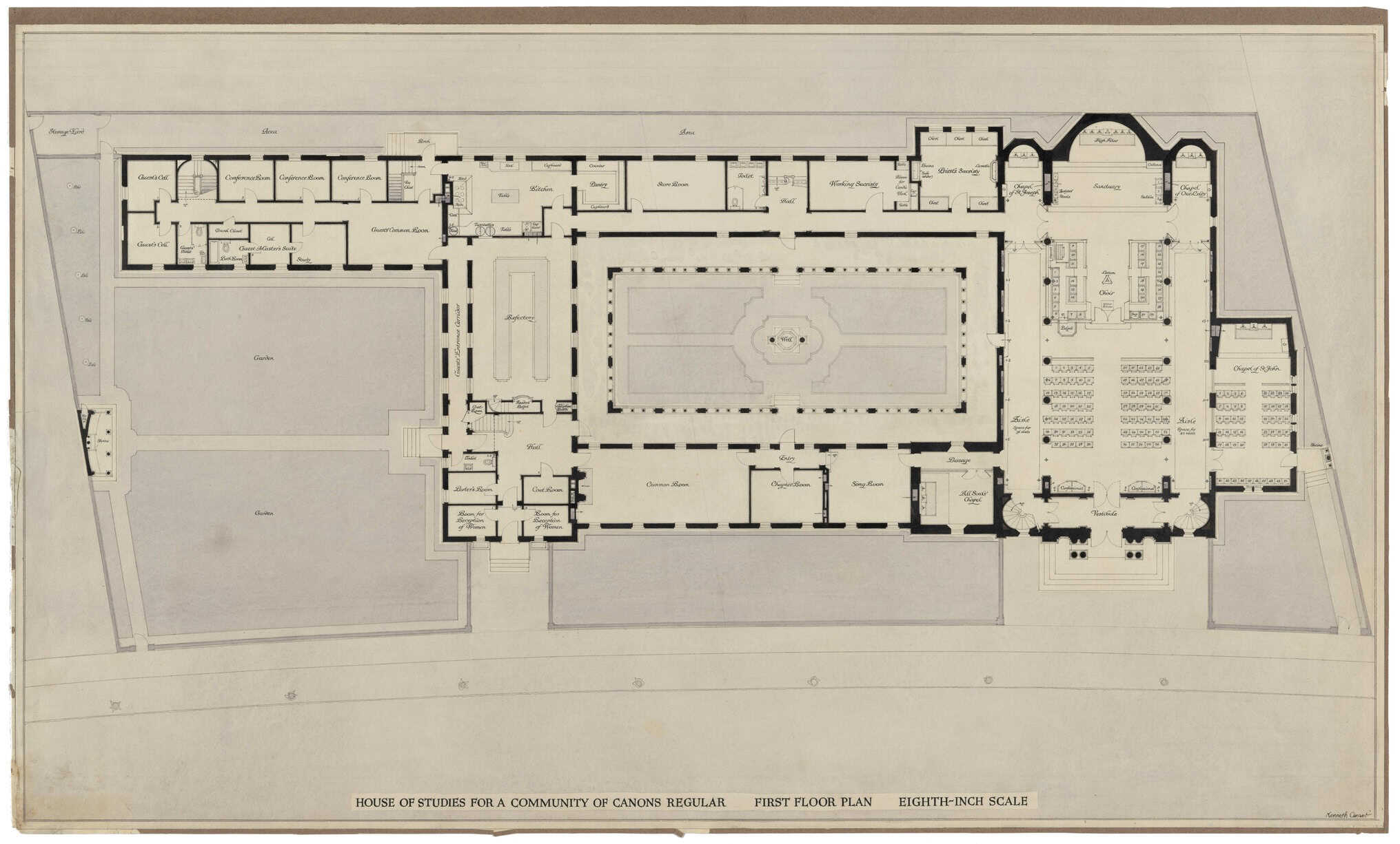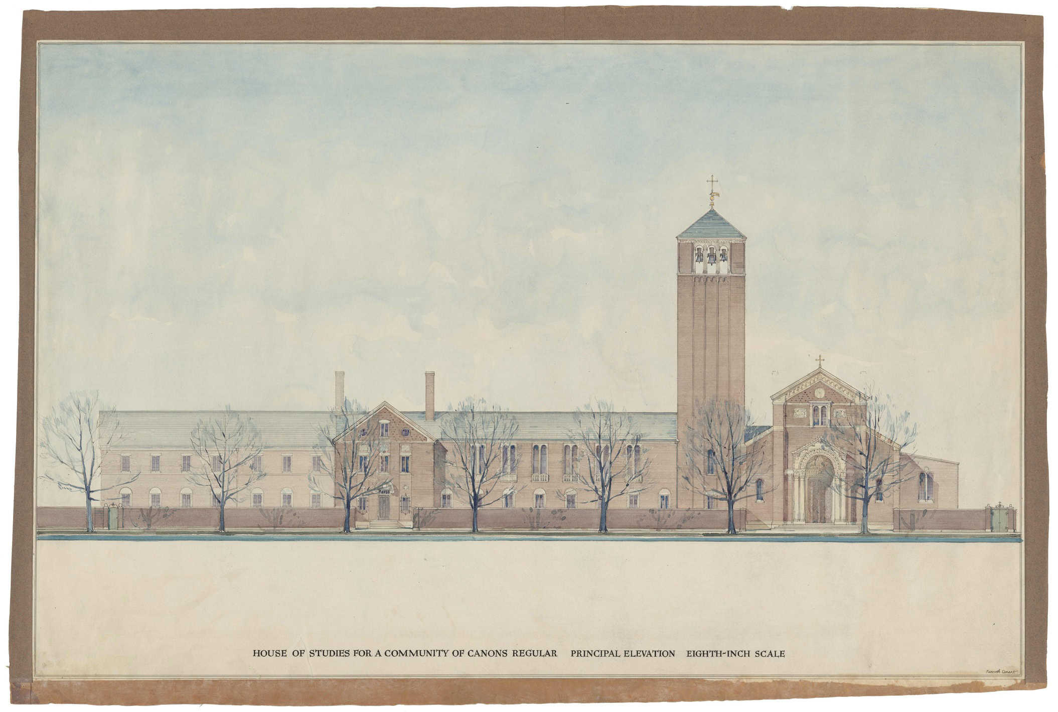 Kenneth Conant, having received his B.A. from Harvard College in 1915, enrolled in Harvard’s recently-founded (1914) graduate school of architecture. An oil portrait by Denman Ross, perhaps his teacher of art and design theory, shows the young man in his first year of graduate study (fig. 1). Conant’s drawing assignments for Fine Arts 2a from about this same time, depict a Harvard dorm room and the just-completed steps and Classical Order of Widener Library’s facade, which had opened to the public in June of 1915 (figs. 2, 3). These drawings attest to Conant’s extraordinarily power of observation and imaginative composition. A fellowship for study at the École des Chartes and the École du Louvre took him to Paris in 1916; when the United States entered World War I in 1917, Conant enlisted. He received his MArch in 1919 – it was delayed because of his service in World War I — with a thesis project for a monastery in Cambridge, Massachusetts (figs. 4, 5, and 6). Conant worked briefly for fellow architect and Harvard graduate William Graves Perry, a founder of today’s Perry Dean Rogers Partners Architects, and talked about projects with Ralph Adams Cram. Designed in the Romanesque style, Conant’s thesis project anticipated the monastic complex (now the guesthouse) built by Cram some four years later for the Society of Saint John the Evangelist (the Episcopal Cowley Fathers) on Memorial Drive in Cambridge (fig. 7). It was during conversations between Conant and Cram about this monastery project that its patroness, Isabella Stewart Gardner, insisted Conant be baptized in the Episcopal Church and offered herself as sponsor. In 1920 Conant was hired as an instructor in architectural design at the Harvard Graduate School of Architecture. Promoted to assistant professor in 1925 and full professor in 1936, he taught studio and lecture courses at Harvard until retiring in 1954.