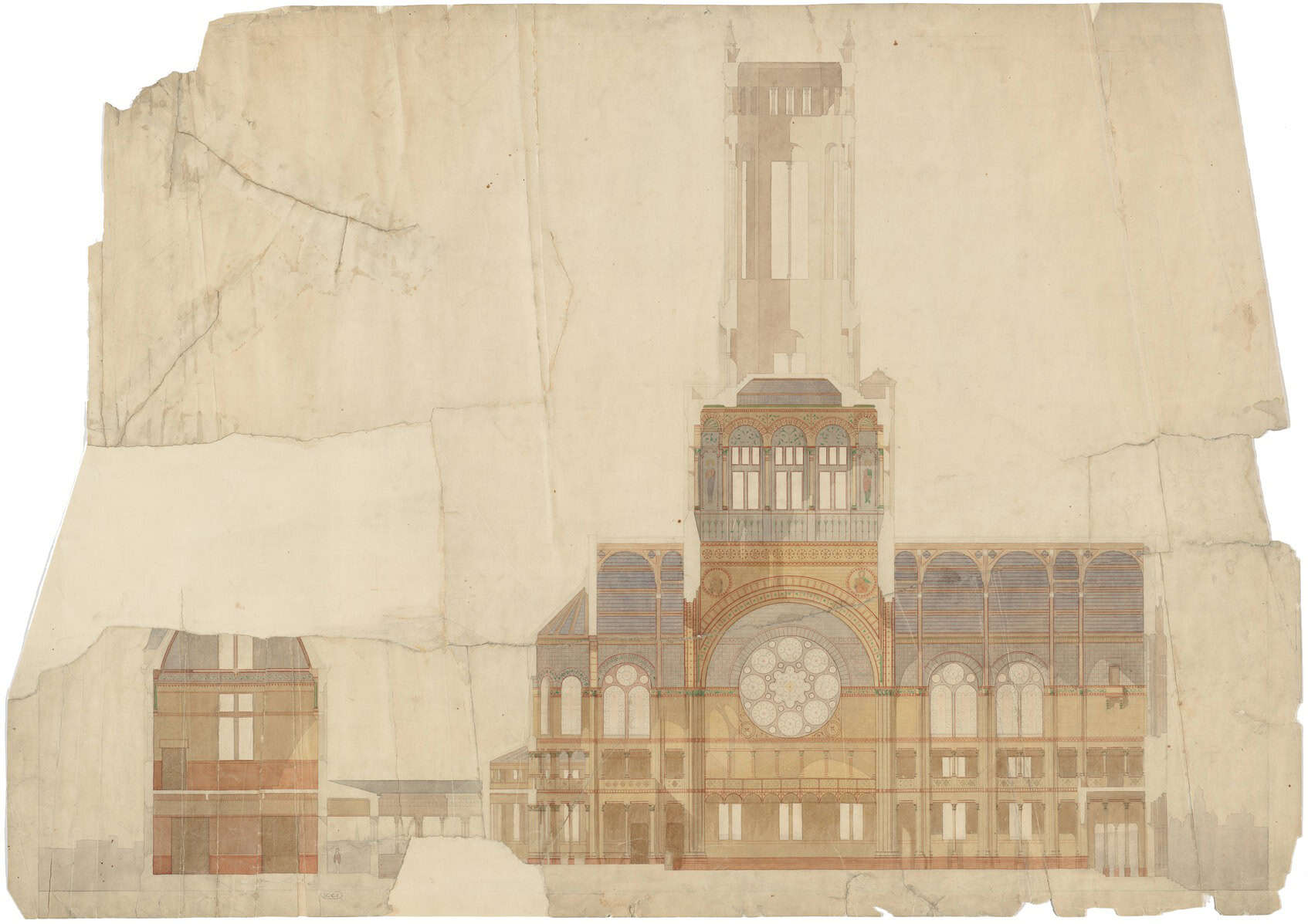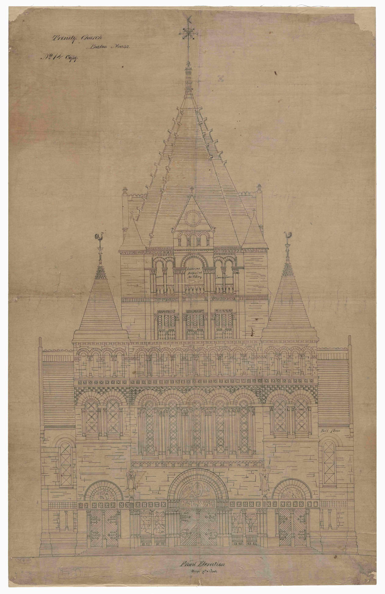 But if Conant’s education acquainted him with multiple historical styles in architecture, including the Romanesque, these styles often served as little more than repositories of isolated morphological options, especially for ornament. Good examples are two Warren drawings for the Alexander Orr house in Troy, NY, one with a Romanesque and the other with a Renaissance entrance porch (figs. 12 and 13), the vocabulary of the latter perhaps drawn from a cast of the balcony from the Palazzo Cancelleria in Rome later displayed in Harvard’s Robinson Hall (fig. 89). This same interest in the evocative part rather than the structural whole is evident in examples from Richardson’s collection of over 3,500 photos now in Special Collections at the Graduate School of Design: a detail of a highly-ornamented Spanish staircase (fig. 14); gothic tracery from Tarragona Cathedral’s south/west portal (fig. 15); the picturesque massing of St. Nectaire rising above vernacular houses in Puy de Dome, France (fig. 16); the fall of light on the trumeau and jamb figures in the south porch at Chartres (fig. 17). Only rarely is architectural structure the main subject of the photograph (fig.18). Of course, these were the photographs available to Richardson for purchase, not images he composed himself, but by circumscribing his understanding of historical architectural form they influenced his own composition. For example, comparing the exterior massing of the church of Nore Dame du Port (Clermont Ferrand) in Richardson’s photo (fig. 18) to the north elevations, interior and exterior, and plan of his 1872 presentation drawings for Trinity Church (figs.19, 20, 21) shows that what he drew from the vaulted crossing flanked by high barrel vaults (the Auvergnat “lantern-transept”) shown in this model was a solution for a well-lit crossing with transepts tall enough to accommodate gallery seating, thereby satisfying his patron’s requirement that every seat afford a good view of the altar and pulpit. This was good and useful knowledge for the architect, but not such as to suggest a deep engagement with Romanesque structural systems. As to style, in comparison to Notre Dame du Port Trinity has much more stained glass, including what is practically a gothic rose window in the transept (fig. 20), and while Trinity’s central tower terminates in a conical roof as at the Auvergnat church, its height and the steep profile of the roof (fig. 22) seem rather more gothic than Romanesque. Looked at closely, the presentation drawings owe a great deal to that love of intricate pattern and textural contrast captured by the historical excerpts of buildings so abundantly represented in his photo collection.