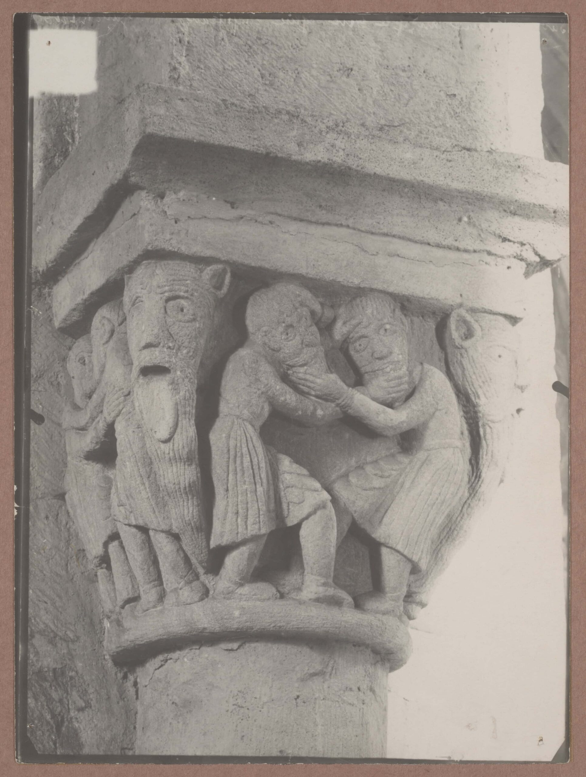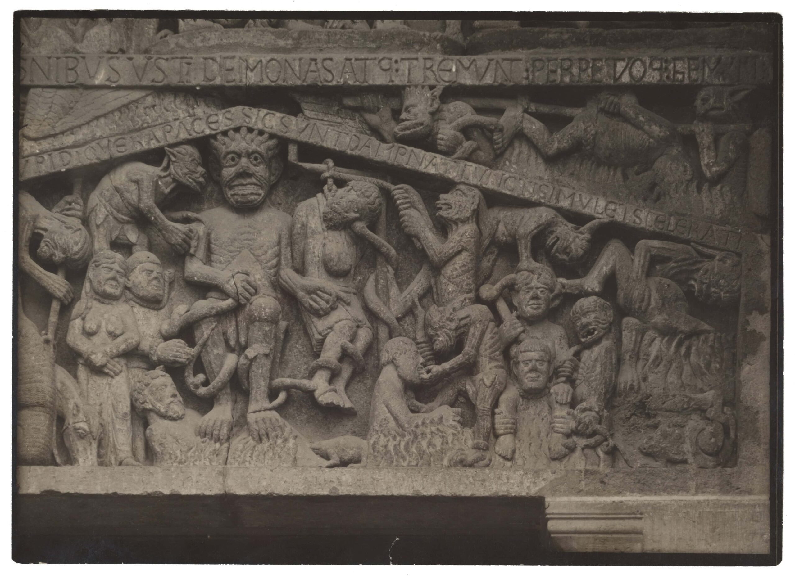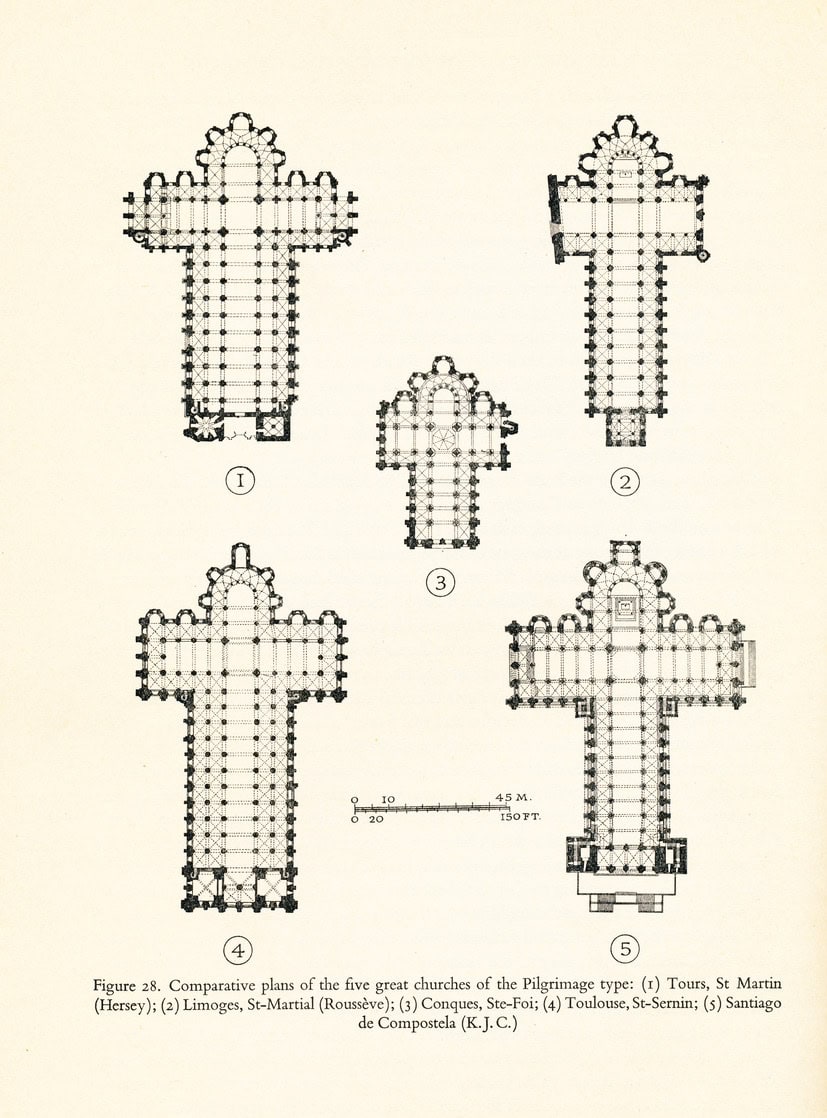 Conant’s understanding of what to do with the past changed when he met Arthur Kingsley Porter (1883-1933) (fig. 23), probably in the same year that Porter left Yale for the Art History department at Harvard, 1921. In the foreward to his Carolingian and Romanesque Architecture, 800-1200 (1959), Conant described himself as “academically the heir of Herbert Langford Warren and his teachers Henry Hobson Richardson and Charles Eliot Norton.”[1] Yet, so Conant continued in the foreward, “the greatest direct indebtedness of the author is to this mentor, colleague, and friend, Arthur Kingsley Porter.” Porter’s reputation as a medievalist had been established in 1909 with his two-volume Medieval Architecture: Its Origins and Development, in which he interpreted buildings within their historical, social, and intellectual contexts; Conant met Porter just before the latter’s ten-volume Romanesque Sculpture of the Pilgrimage Roads (1923) brought the discipline of art history into the twentieth century by presenting a photographic catalogue as a primary research result (figs. 24, 25, 26, 27, 28). Of course, photographs had been used by art historians before this. Charles Eliot Norton (1827-1908), the first professor of Art History at Harvard, may have passed photographs as well as prints round to his students, although his teaching hewed closely to his main interest in the history of the fine arts as connected to literature (the title of his most popular course). Indeed, Conant’s historical scholarship was founded on the photos of ancient, medieval, and Renaissance buildings that Warren, believing that a grasp of the aesthetic principles of great architecture should underlie students’ technical training, had insisted the library acquire. By 1907, at a time when the Fogg Museum owned 3,643 lantern slides, the architecture school already had around 8,000. Richardson, whose own photographic collection contained over 3,500 items, also considered photos to be indispensable resources for architectural knowledge. However, Porter’s systematic visual documentation of sculpture found along medieval routes used by pilgrims regardless of its quality or condition enabled fine-grained scholarly analyses of the diffusion of artistic ideas, methods, and techniques across broad geographic areas, enabling stylistic, cultural, and chronological classifications to be proposed: in short, he employed a scientific method akin to that of biology or other physical sciences. Like Richardson’s photos, Porter’s focused on the telling detail, but these excerpts were either of iconographic interest or to illustrate a particular manner of carving. Importantly, Porter and his wife Lucy (1876-1962) took their own photos: a photo of a statue without its head (fig.28) would have been unthinkable for a commercial photographer to sell. But if, for Porter, the point was to document the linear, wavy, and zig-zag patterns of the figure’s drapery, its head was irrelevant. In another example, this one from Ste. Foi at Conques around 1120 (fig. 27), Porter captured a secondary figure,the hung man, rather than the devil himself as the photograph’s center of interest. Porter here sacrificed symmetrical composition for the significant detail because since this same, or a very similar, hung figure appeared on a capital at St. Lazare, Autun, in Burgundy within the same decade, connections between the two chantiers might be hypothesized. Later, Conant would adapt Porter’s method of classification by type to architecture, distinguishing a group of important Romanesque churches with similarities in plan and elevation as the “pilgrimage group,” one on each of the main roads from France to Santiago de Compostela: St. Martin at Tours, St. Martial at Limoges, Ste. Foi at Conques, and St. Sernin at Toulouse (fig. 31).