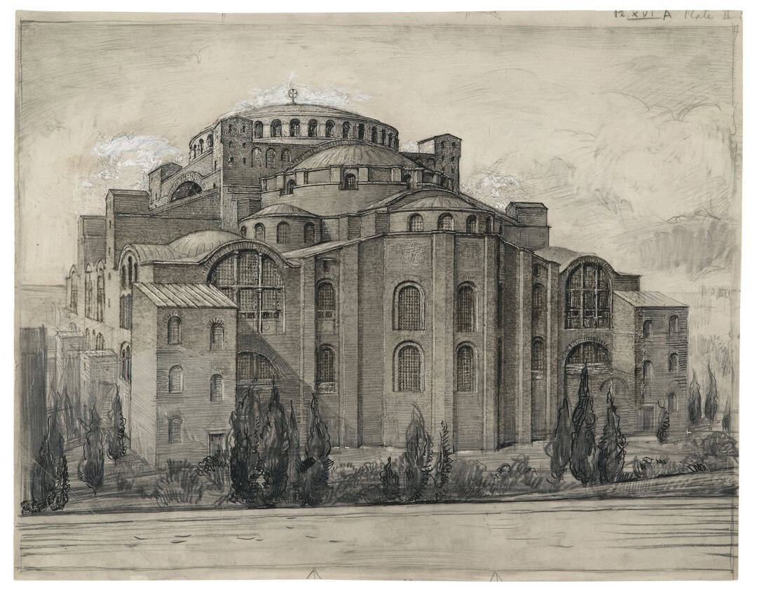 Under Porter’s direction, Conant wrote his Ph.D. dissertation titled The Early Architectural History of the Cathedral of Santiago de Compostela (1925). Compostela was the end goal of the pilgrimage routes studied by Porter and, later, by Conant. While Conant meticulously documented the (then) current state of the building fabric (fig. 29), his purpose was to discover the original design for this extraordinarily consequential church. As his dissertation title acknowledges, buildings have histories – they evolve and change over time. Today, many scholars of medieval building believe this to be true even within the original building process itself, theorizing that buildings were continuously re-designed in successive, annual building campaigns, since construction took place only when weather permitted, essentially from spring to fall. The idea that there was an original design for the entire building before construction started and that the built building was essentially the realization of this holistic conception is considered unlikely by many scholars today.[2] But for Conant, the very aim and purpose of establishing a building’s chronology was to reveal its original state and, by removing later alterations, to make manifest the original idea of its architect. He proposed such solutions for Santiago de Compostela (figs. 30, 32) and other medieval and Renaissance buildings such as the monastery of Montecassino, Saint Denis outside Paris, Speyer cathedral, St. Sophia in Kiev, and St. Peter’s in Rome (figs. 33, 34, 35). In one unusual case, The Holy Sepulcher complex in Jerusalem, he proposed an early original phase as begun by the emperor Constantine 327-335 A.D. and a later original state as completed eight years after Constantine’s death in 337 (figs. 36, 37). Since the physical fabric of the extant complex didn’t permit such fine distinctions, this shows how closely Conant relied on literary sources and their interpretation in the scholarly literature for his reconstruction drawings. Yet Conant thought like an architect. We see this in his choice – novel, as far as I know—to represent Hagia Sophia from the apse rather than facade because that view best reveals how half domes, barrel vaults, and buttresses supported the buiilding’s first, failed, dome (fig. 38). His architectural imagination, while always based on sober facts, was sometimes witty, as when he contrasted a transverse section of the simple monumentality of Old St. Peter’s immense structure to the rather fussily worked surfaces of the new Fogg Museum as if commenting, “this is a façade, that is a space.” (fig. 39). Conant had an extraordinary ability to envision what no longer physically existed. And he restored to our minds and eyes the original appearance of the Abbey of Cluny III.